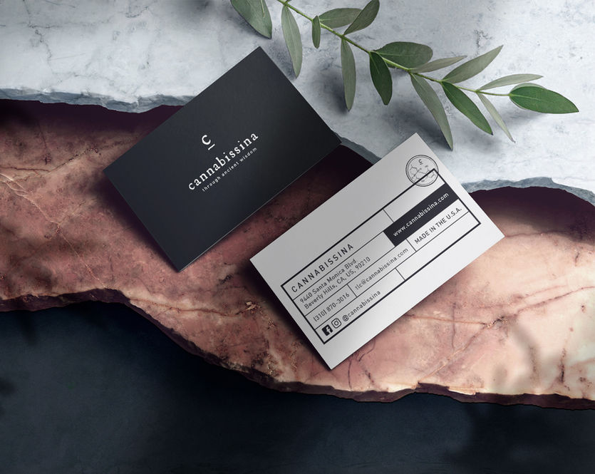 Art direction, Logo & brand identity design, labels and packagings design, branding of the wellness CBD brand Cannabissina. Letterhead, business cards design. Los Angeles based Brand, Organic product without THC © Studio Delatour Design Paris / Cannabissina.