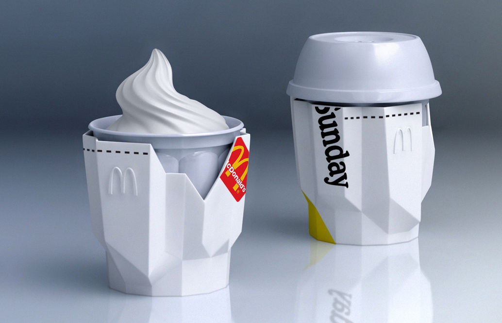 However, my favorite project remains this one : not regular MacDonald's tableware, plate, pot and glass, but a faceted hybrid, between plates and overwrap organic rubber packaging (bio-rubber)! No more cardboard and stains right on the table, no plates you put your fries and burgers in by hand to make your table less messy, but rubber shells in which to place your BigMac, your fries, the Sunday and drink directly in without even taking them out of their original packaging boxes.
